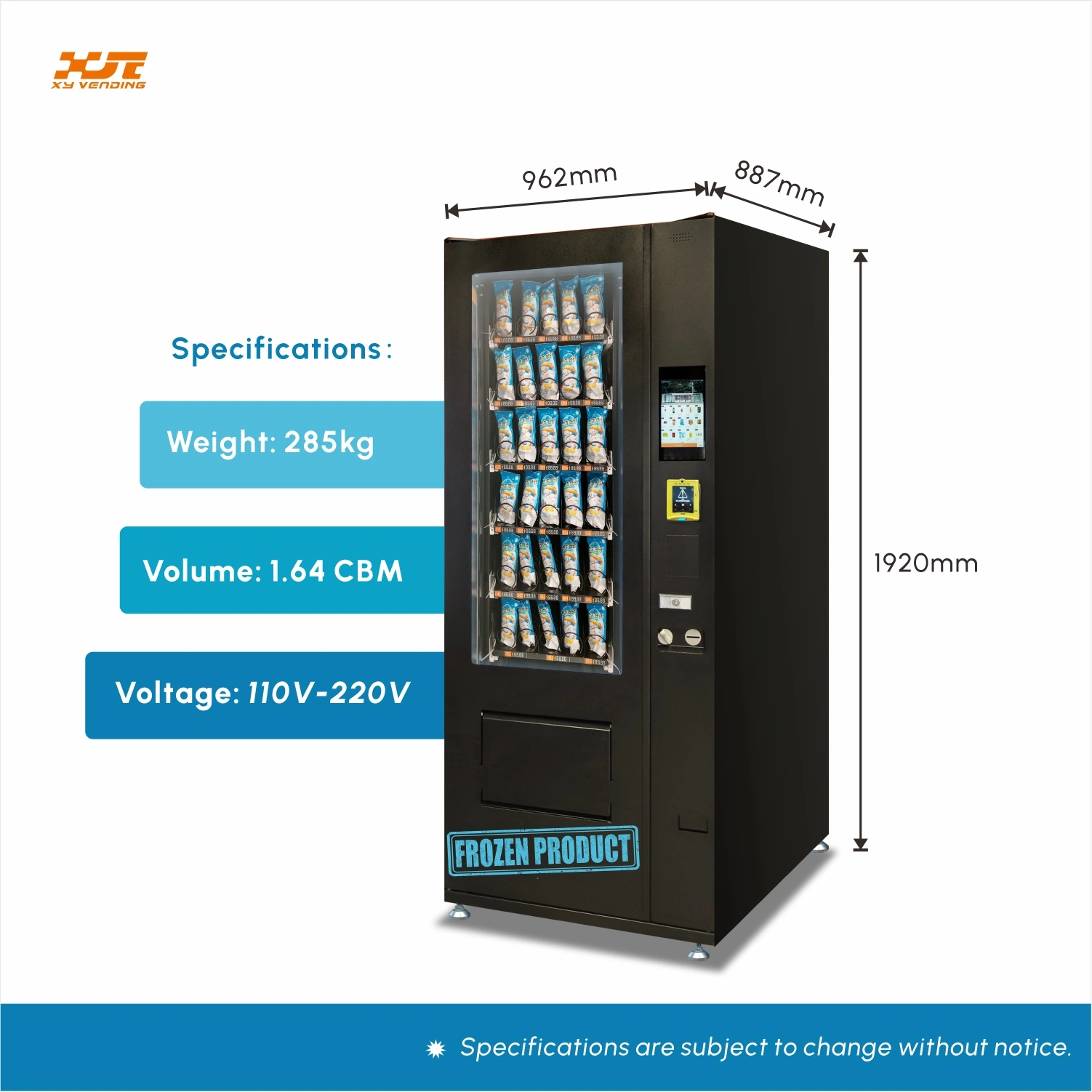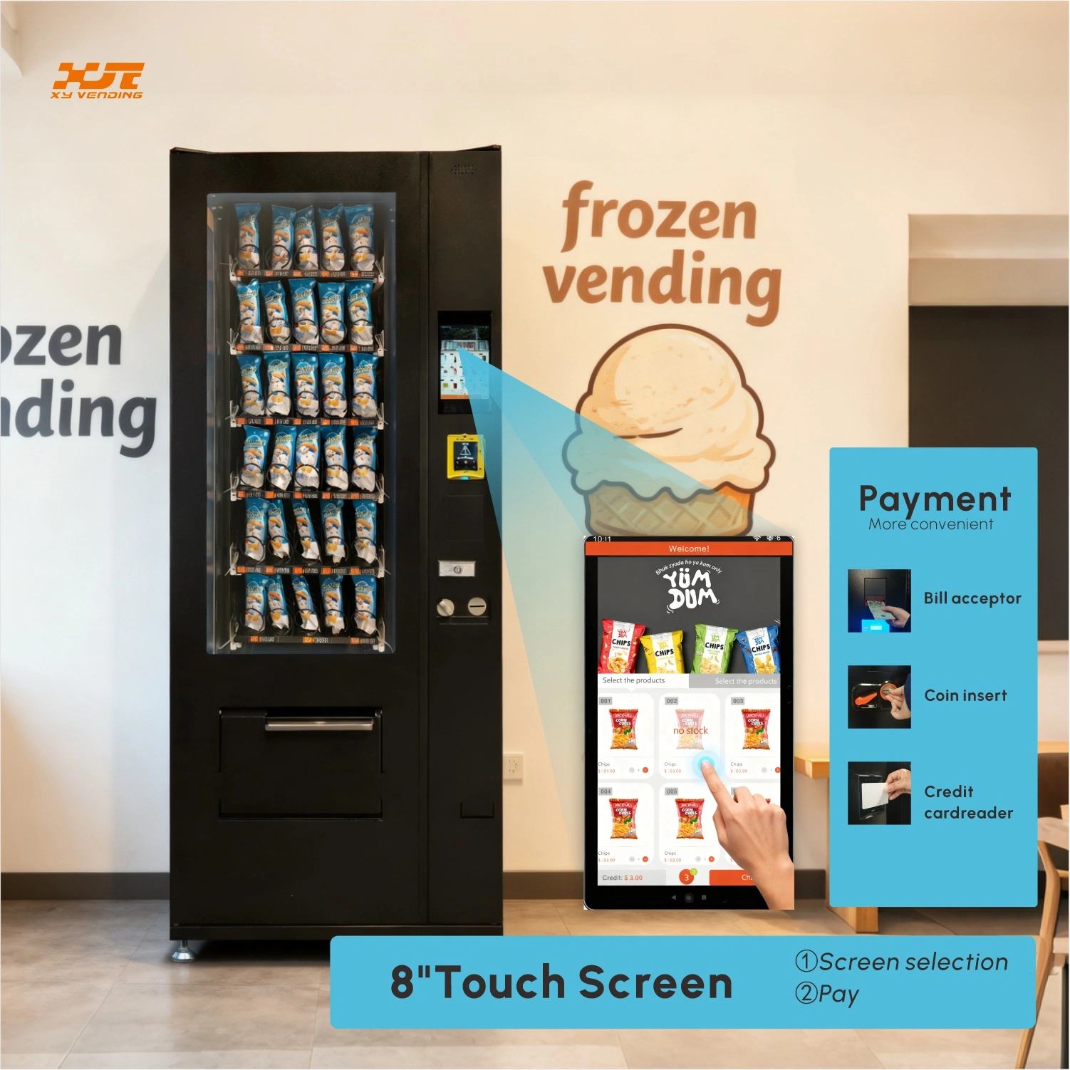 Space-saving small-sized frozen food vending machine with touch screen