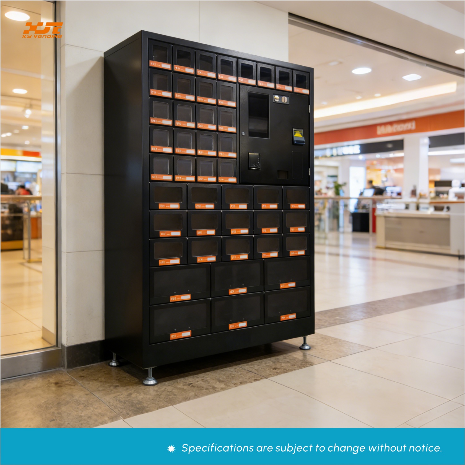 The 45 storage compartment vending machine can sell various types of goods that can be stored at room temperature. Multiple payment systems can be installed, and the system supports customization of localized payment methods by customers.
